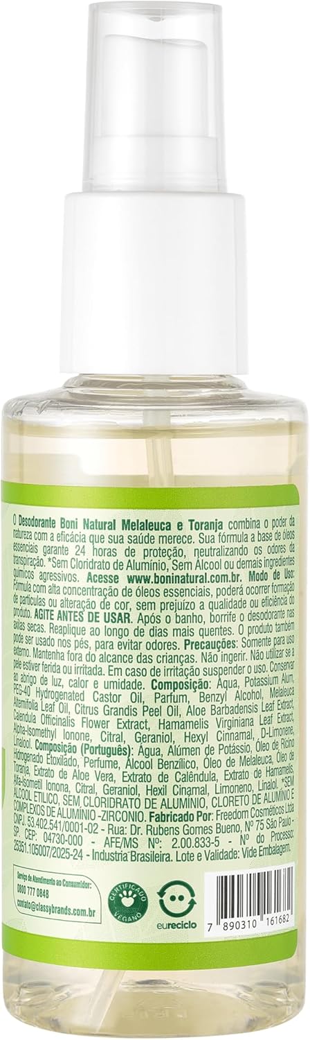 Desodorante Natural e Vegano com óleos essenciais de Melaleuca e Toranja, 24h de proteção, Sem Alumínio, Sem Parabeno, Boni Natural, Transparente